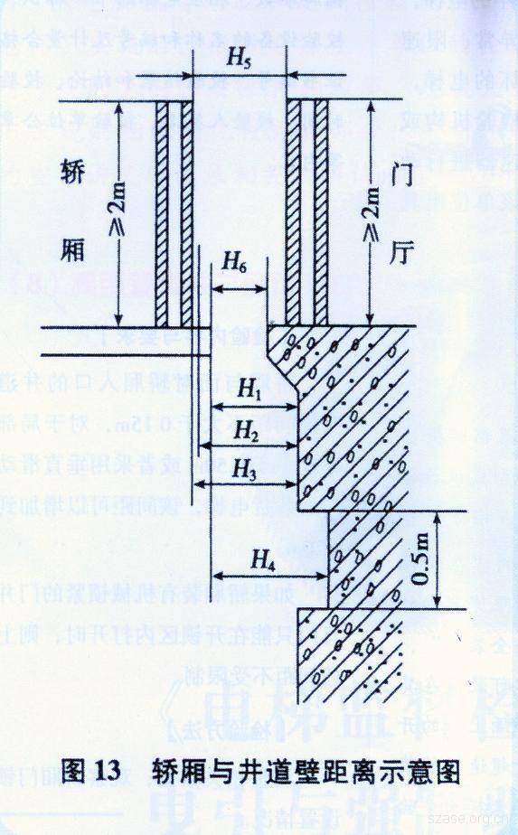“局部高度小于0.50m或者采用垂直滑動門的載貨電梯,該間距可以增加到0.20m”,指的是:間距允許增加到0.20m,條件是其高度不大于0.50m;對于采用垂直滑動門的載貨電梯,在整個行程內間距可增加到0.20m。如圖13中的H4。02版檢規無此項要求。02版檢規無“如果轎廂裝有機械鎖緊的門并且門只能在開鎖區內打開時,則上述間距不受限制”這一要求。